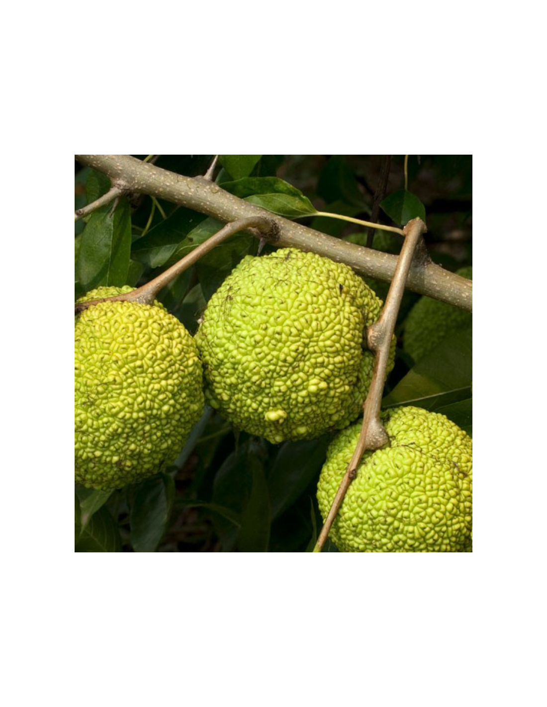 Le Maclura pomifera, communément appelé Oranger des Osages ou Bois d'arc, est un arbre originaire du centre des États-Unis. Il est réputé pour sa robustesse et la qualité de son bois. Les feuilles sont caduques, simples et alternes, mesurent entre 8 et 12 centimètres de long sur 5 à 8 centimètres de large. Elles sont épaisses et fermes, devenant jaunes à l'automne. Les arbres femelles produisent des fruits verts de la taille d'une orange, de forme sphérique et à la surface bosselée. Ces fruits, bien que ressemblant à des oranges, ne sont pas comestibles. L'intérieur est blanc, compact, homogène avec de petits pépins marron foncé. Ils exhalent un parfum citronné légèrement épicé. A installer en haie défensive ou en sujet isolé.