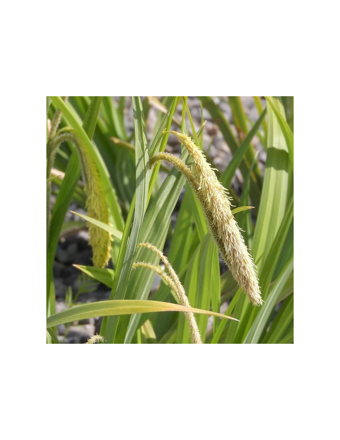 Grande graminée rustique adaptée aux berges et zones humides. Son feuillage est persistant, élancé et souple. Des épis bruns retombants apparaissent en mai et perdurent durant l'été. Très graphique, ce carex se ressème également aisément.
