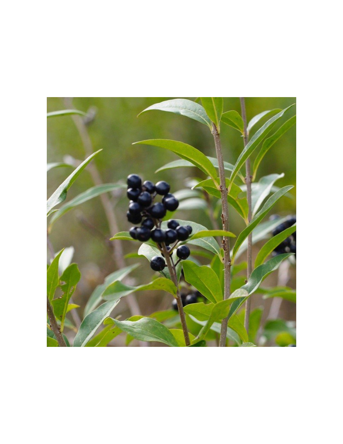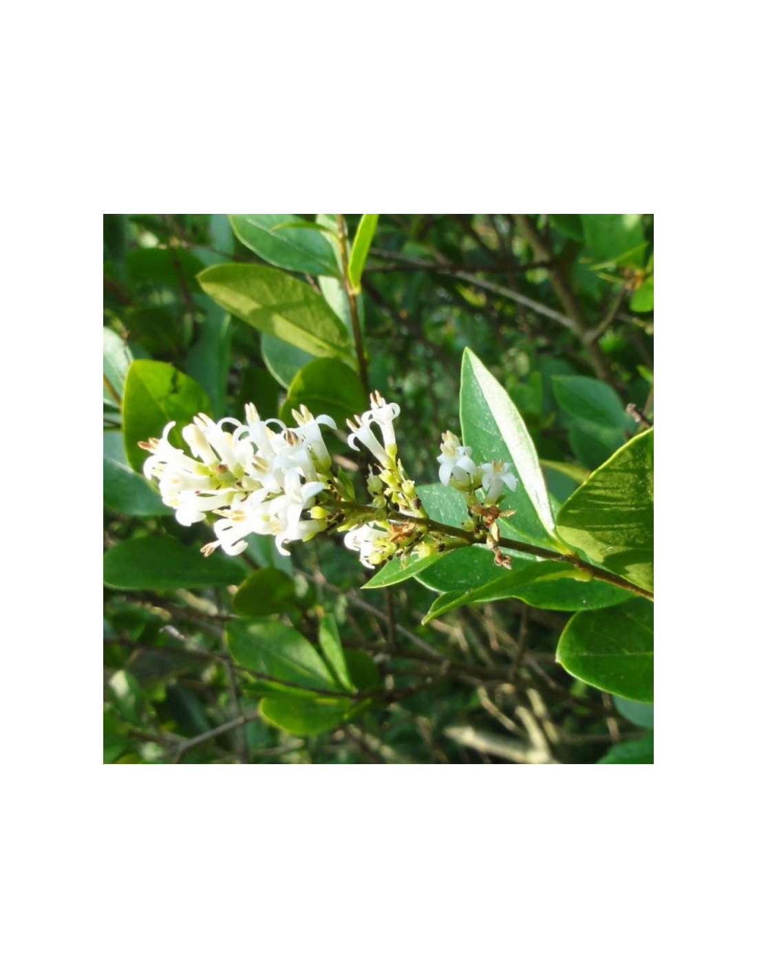 Arbuste rustique au feuillage semi persistant utilisé en haie basse ou haute. Les feuilles sont ovales, vert foncé. Idéal pour former des haies compactes et linéaires. Son développement est rapide, sa floraison blanche est très parfumée, des baies noires toxiques persistent ensuite longtemps sur l'arbuste.