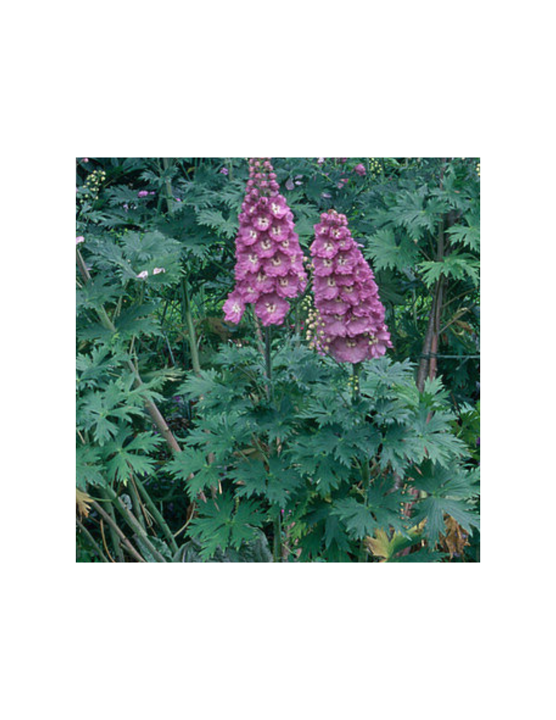 Delphinium rose formant une touffe dense qui se développe rapidement. Sa haute taille permet de l'installer en fond de massif. Son feuillage caduc est découpé, d'un joli vert franc.