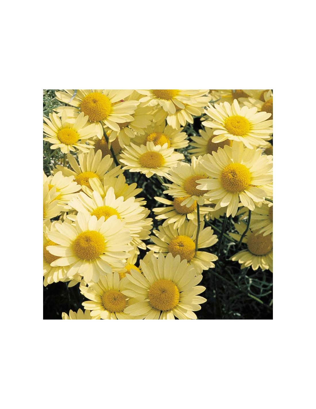 Les fleurs apparaissent dès le mois de juin jusqu'à la fin de l'été sous forme de petites marguerites jaune citron au coeur doré au sommet de tige d'environ 30 cm. La suppression des fleurs fanées engendre une remontée florale.