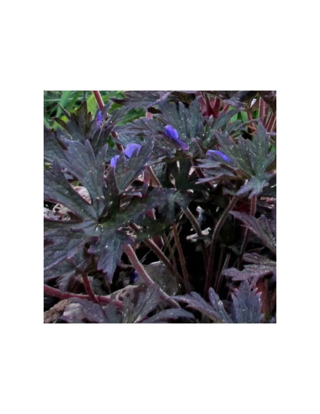 Géranium vivace buissonnant au délicat feuillage pourpre et à floraison bleu lavande.